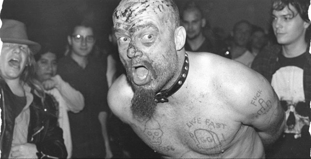 GG Allin was Dionysus in flesh. He shat on concert goers. Smashed bottles over his head. Punched fans in the face and started melees. He shoved a banana up his ass on stage - but, don't worry, that was only after throwing slurs and furniture at the college kids who had the balls to show up. Set to the backdrop of washed out chords and pumping drums, his lyrics were as coarse and raw as his performances: