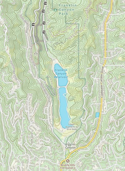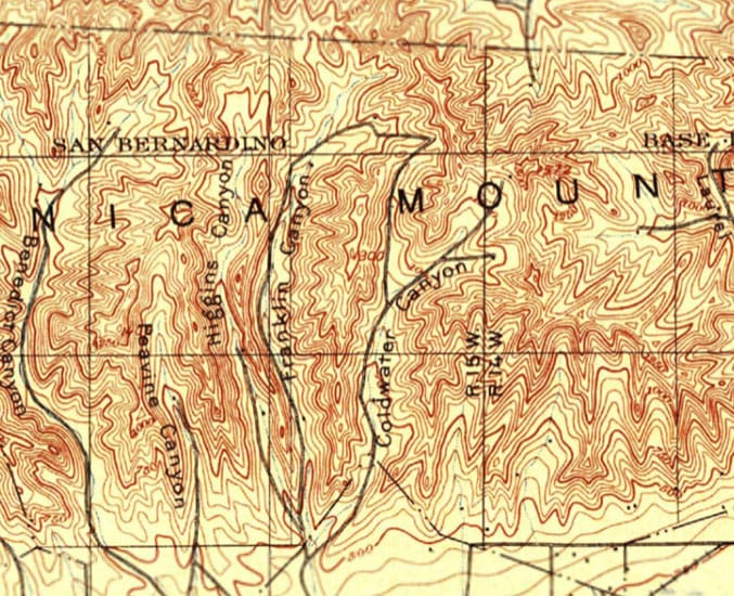 As an example, compare my 1900s map of Franklin Canyon to the modern one before. It's astonishing to see how sparsely populated this area was just a century ago. No Beverly Hills. No reservoir. No Coldwater Canyon Drive. All that existed then was the Santa Monica Mountains and a few roads following the contours of valleys.