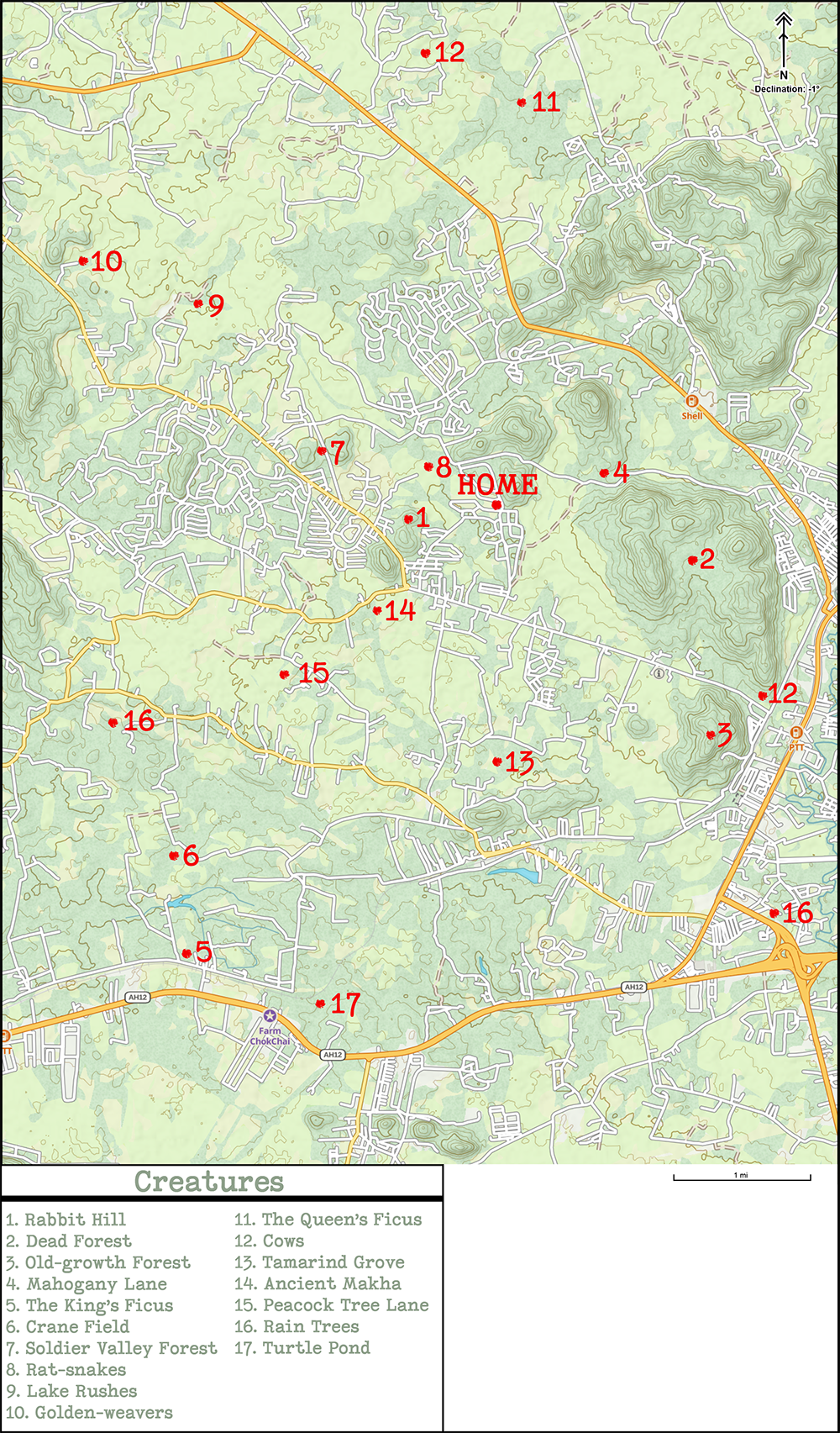 For a crafty project, print out a few simplified 5km² terrain maps. Select and label some of the highlights, such as: