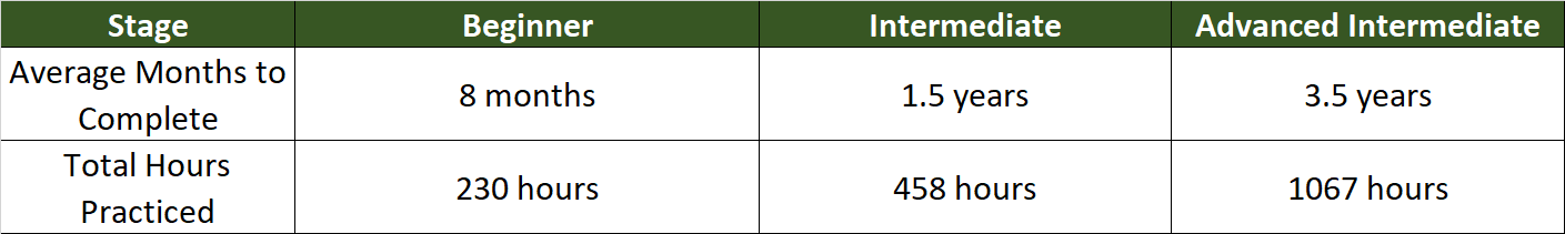 The next chart is the average time line for someone practicing 45 minutes a day and doing 10-days of retreat a year.