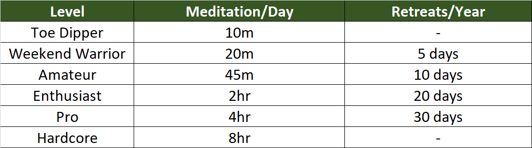 The hardcore category might seem over-the-top, but this is standard for meditation monks, especially those under 10 years. There are some laypeople who also practice that heavily, although they’re usually retired or living simply in the stix. It’s next-to-impossible to manage with a career, although I did manage 5-6 hours a day while working full time for a few years and know many others who’ve done the same.
