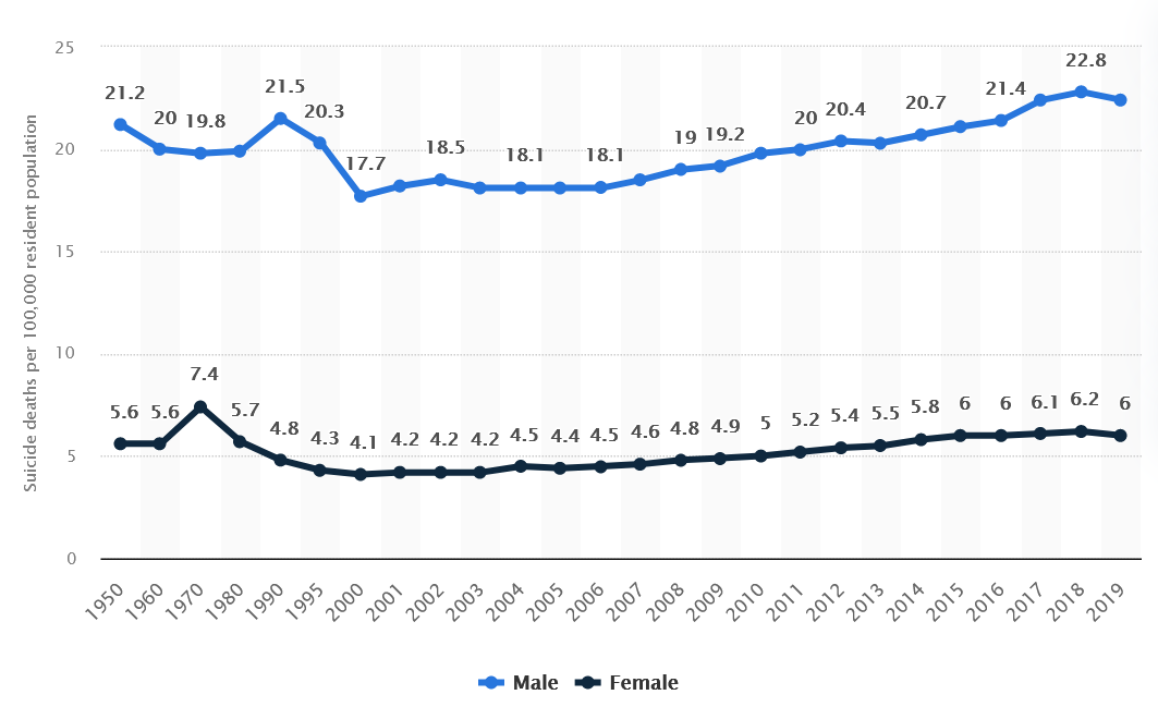 If their suffering was caused by inhumane working conditions, why wasn’t there an epidemic of suicides throughout periods of serfdom, slavery, or at the turn of the industrial revolution when people’s financial circumstances were objectively far worse? For a more precise quantitative comparison, compare the 1950s to today. Despite greater purchasing power and wealth, the suicide rate has remained relatively steady.