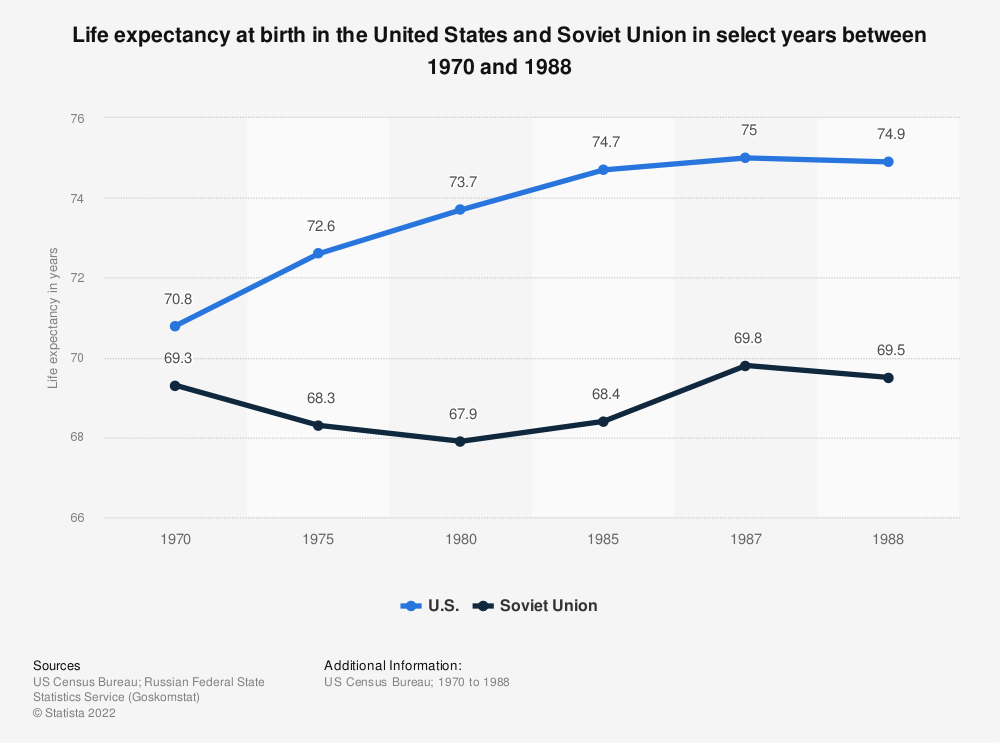 Communists might protest that Russia might have produced less, but there was more parity, which is also only partially true. The average American was richer, had more spending power, and had access to better infrastructure and services than the average Russian did by a wide margin. A testament to the improved conditions in America is that millions of Russians migrated to America and Europe during the USSR’s reign, yet very few made the trip the other way around. Another metric to compare the differences in well-being is life expectancy, shown below.