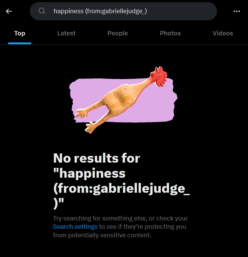As proof of how low on the list of topics happiness is, I searched several keywords of Gabrielle Judge’s Twitter to find at least an argument or hint of one and came up with nothing. Other keywords, like “joy,” were duds. Her TikTok is similarly barren.